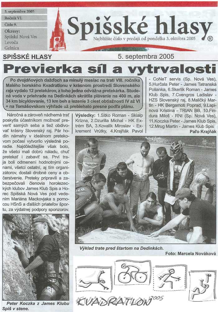 VIII. ročník unikátneho preteku - "Malý horský kvadratlon" - zloženého zo štyroch disciplín, ktorý je určený hlavne pre horolezcov, skialpinistov, horských bežcov a cyklistov sa uskutočnil 6.8.2005. Štartovalo sa o 1020 na Palcmanskej maši (hotel Priehrada) a cieľom bol Tomašovský výhľad. Vyhodnotenie a odovzdávanie cien prebehlo na chatke TJ Tatran na Čingove.