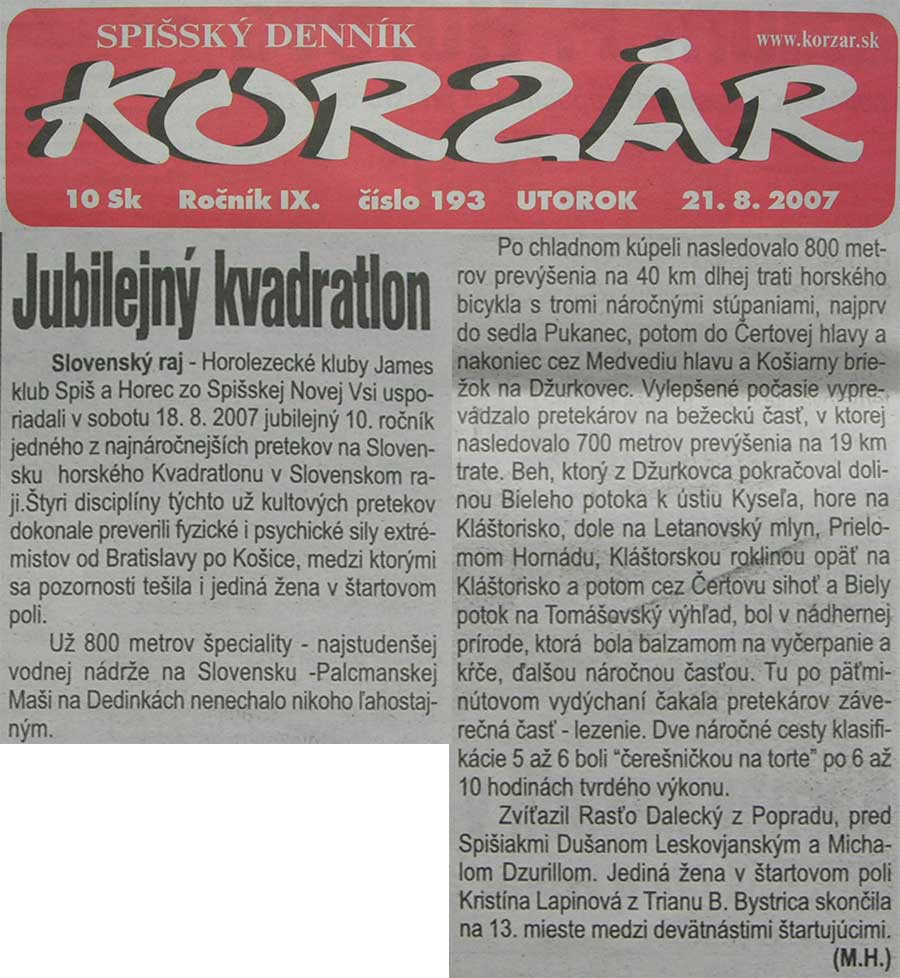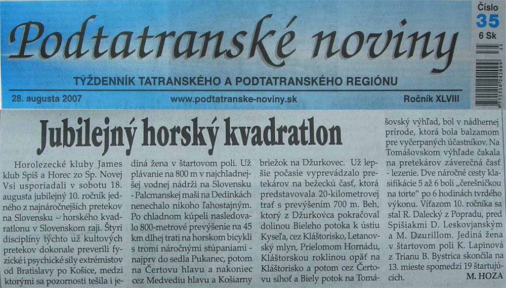 X. ročník unikátneho preteku - "Malý horský kvadratlon" - zloženého zo štyroch disciplín, ktorý je určený hlavne pre horolezcov, skialpinistov, horských bežcov a cyklistov sa uskutočnil 18.8.2007. Štartovali sme o 1013 plávaním na Palcmanskej maši a skončili lezením na Tomašovskom výhľade. Vyhodnotenie, odovzdávanie cien a občerstvenie prebehlo na chatke TJ Tatran na Čingove. Nočná búrka, ktorá rozmočila trať a priniesla oblačné počasie neodradila 18 pretekárov a jednu pretekárku, ktorí sa postavili na štart. Náročná, ale výborne postavená a krásna trať, umocnila jubilejný X. ročník a dala všetkým štartujúcim riadne zabrať. Organizátori a zároveň povzbudzovatelia nám pomohli prejsť všetkými nástrahami a všetci sme nakoniec skončili v cieli. Poradie je nasledovné: