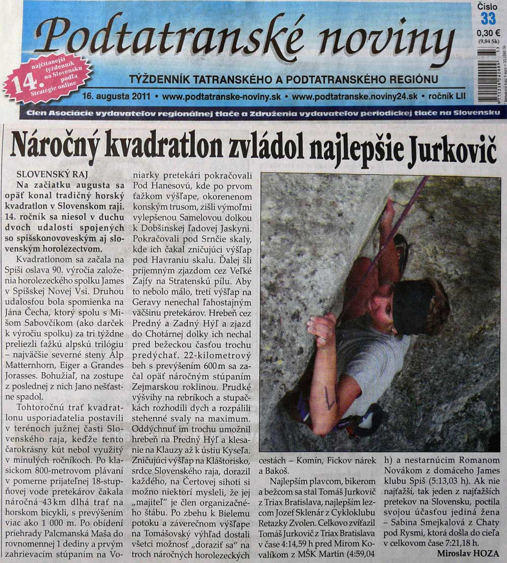 Ďalší, už XIV. ročník unikátneho preteku - "Malý horský kvadratlon" - zloženého zo štyroch disciplín, ktorý je určený hlavne pre horolezcov, skialpinistov, horských bežcov a cyklistov sa uskutočnil 6.8.2011. Štartovali sme o 1020 na Palcmanskej maši plávaním, pokračovali krásnym bicyklovaním cez Hanesovú, popod Havraniu skalu, cez Stratenskú pílu a Geravy na Biele vody a za lezením sme sa prebehli cez Klauzy a Kláštorisko na Tomašovský výhľad. Vyhodnotenie, odovzdávanie cien a občerstvenie bolo na Čingove.